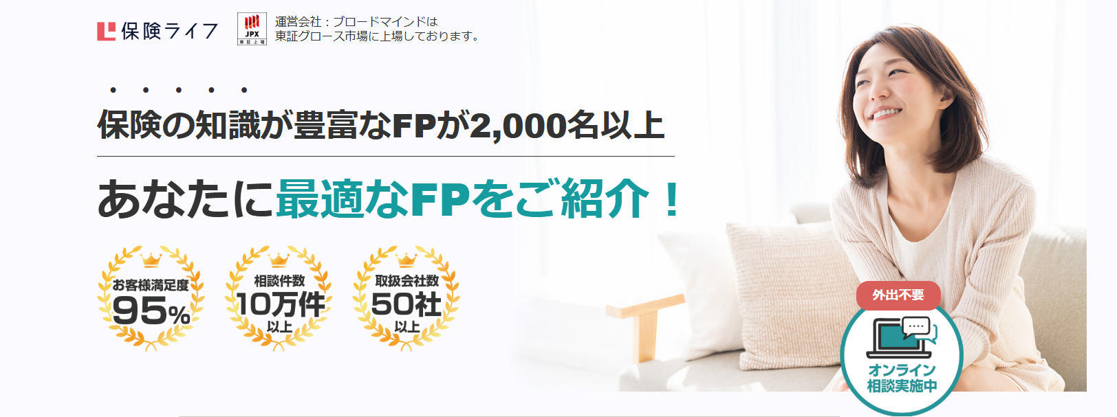 「保険ライフ」は、ブロードマインド株式会社が提供する保険相談サービスです。同社は2002年に設立され、20年以上の運営実績を誇っています。本社は東京都渋谷区にあり、2,000名以上の経験豊富なファイナンシャルプランナー(FP)が所属しています。この豊富な経験と長期的な運営による実績により、多数のお客様に信頼されてきました。顧客満足度は95%と高い評価を受けており、相談件数も10万件を超えています。
